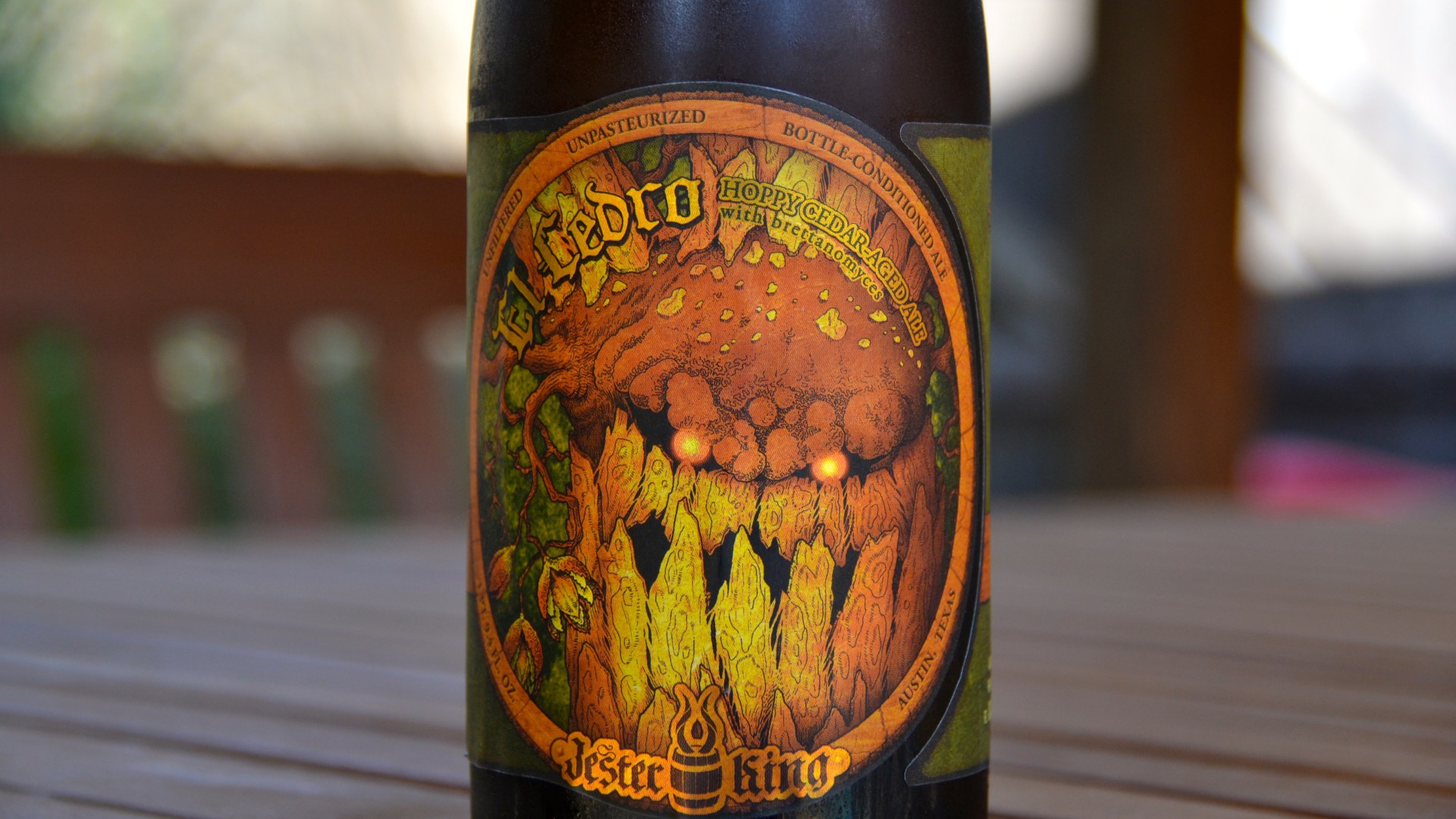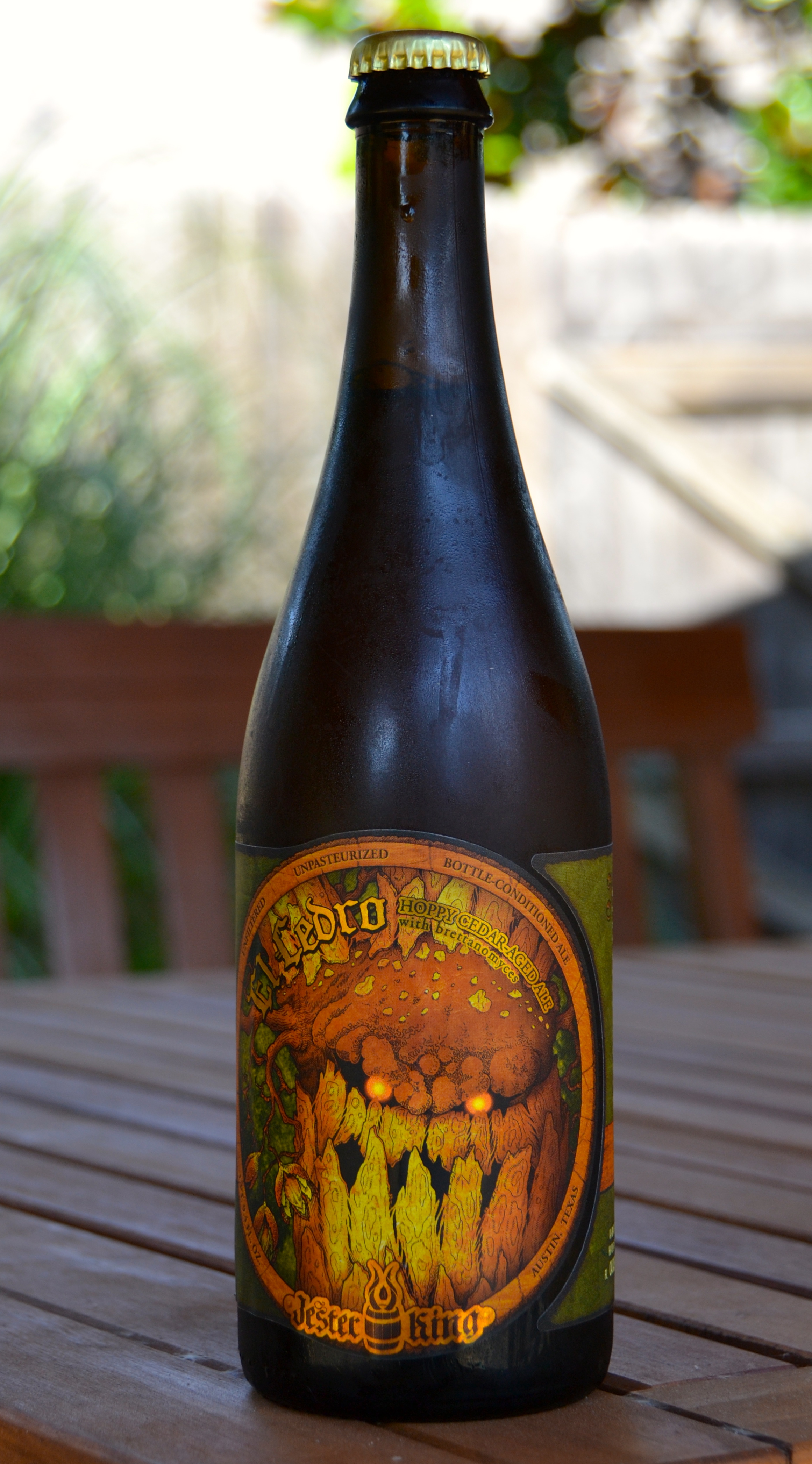 The beer I am trying today is called El Cedro and it’s brewed by Jester King out of Austin, Texas. Jester King is known for their big, bold, and slightly left of center beers. They make some great stuff – I have never had anything from them that I would call “bad” – but I have had a few things that missed the mark for me taste-wise. They are still excellent beers – but some of them are definitely sipping beers. Big, strong, and in your face. They also have some of the best labeling I have ever seen – great comic book-esque drawings – and El Cedro is no exception. The labeling is beautiful.